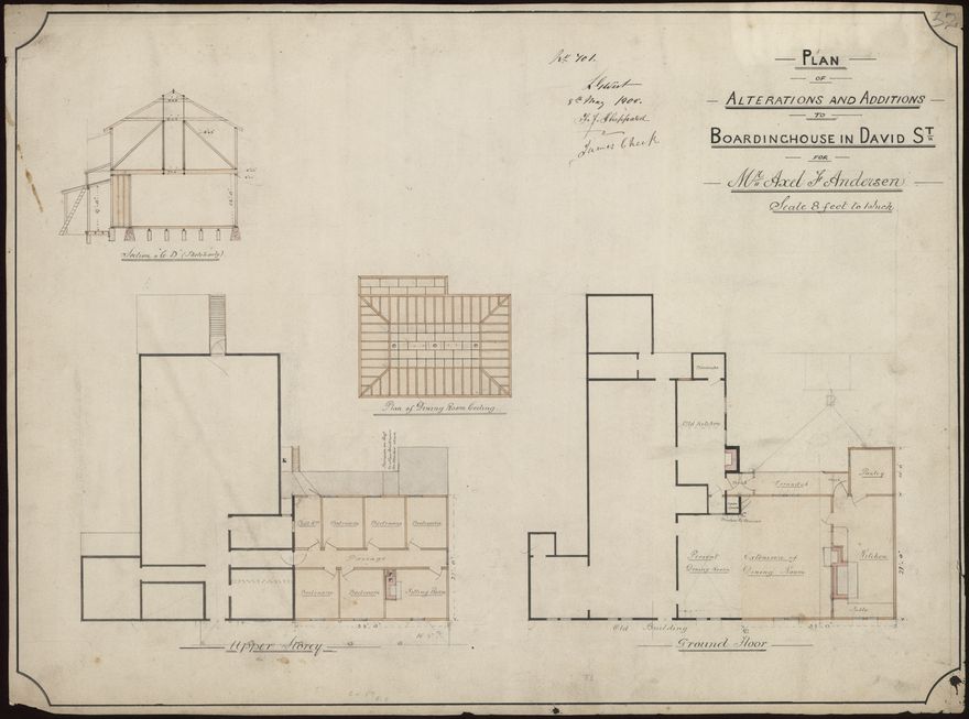 This plan for additions to a two-storey boarding house was designed by L. G. West for Axel F. Andersen. The Danish-born architect Ludolph Georg West (1846-1919) established an architectural practice in Palmerston North in about 1880. In 1912 he formed a partnership with is son, Ernest Vilhem West, who continued the business after his father's death.