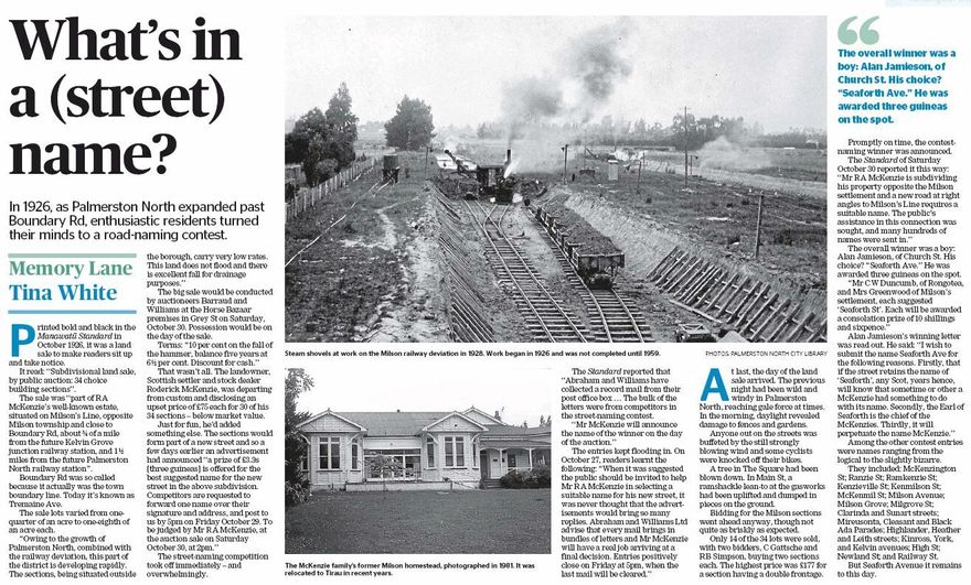 Journalist Tina White's weekly "Memory Lane" article in the Manawatū Standard. The 1926 land subdivision sale of RA McKenzie's Estate on Milson Line and the naming of Seaforth Avenue in a street naming competition.