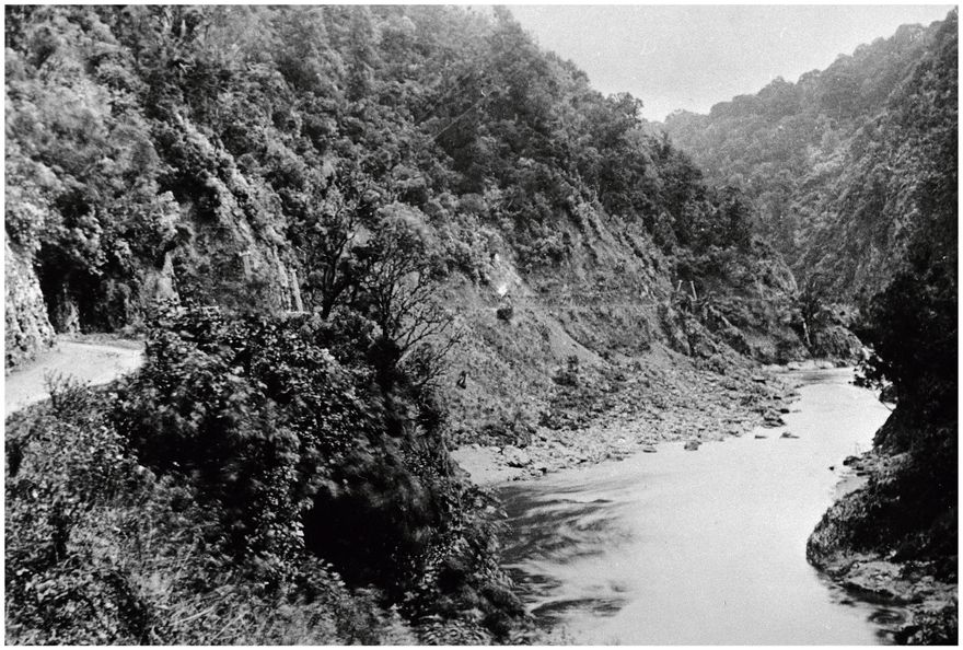 A road throught the Gorge was constructed 1871-1872 linking Manawatu with Wairarapa and Hawkes Bay. Telegraph lines, as seen, were installed through the Manawatu Gorge in 1879 – 1880.