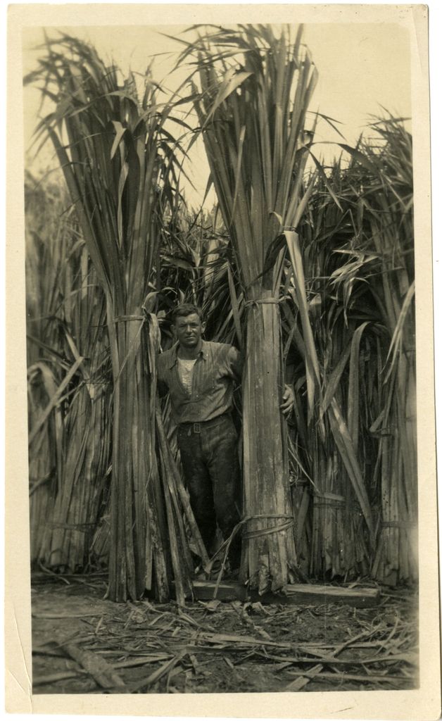 Mr Neil Seifert holding two bundles of flax at the Paiaka Mill. Neil was the son of Herman Seifert, owner of the Paiaka Mill. He purchased in from T.S. Easton about 1926 and operated it until about 1937. Paiaka Mill was situated on the mouth bank of the Manawatu River, about 10 miles upstream from Foxton. The headquarters of the Moutoa Estate Flax Scheme was on the mill site until 1974. The premises have since been turned into a private residence.