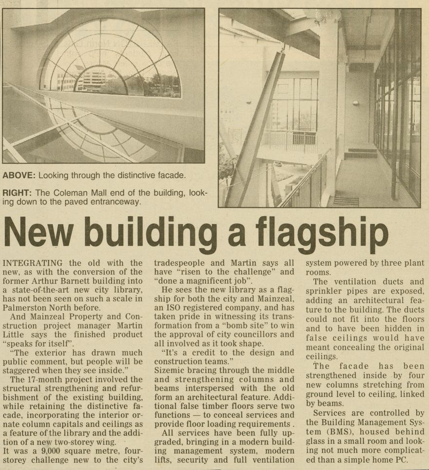 The article discusses the conversion of the former Arthur Barnett department store building in the new Library, by Mainzeal construction company.
