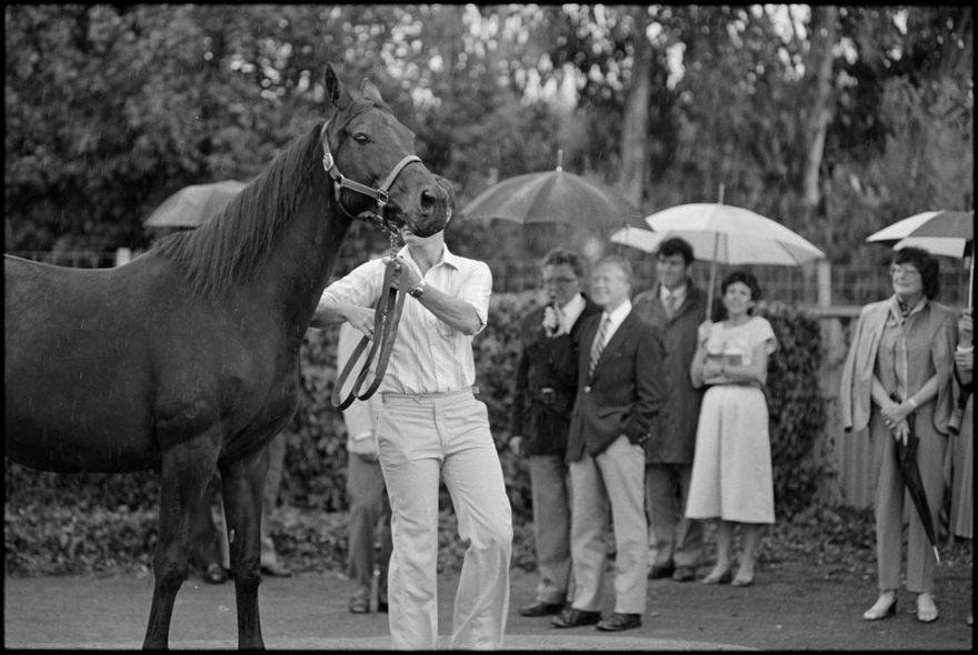 This image was taken by the Evening Standard on the 11th of February 1984 but was not published. It depicts former United States president Jimmy Carter and his wife Rosalynn visiting Highden Park - Herrick and Judy Perry's thoroughbred stud farm at Awahuri.