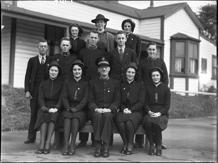 An unknown group of Salvation Army members. The Salvation Army was established in Palmerston North in 1884.