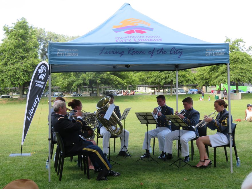 The Virginia Military Institute Brass Ensemble performed in The Square, during a tour of New Zealand. The ensemble consisted of six college cadets who performed with trumpets, trombone, French horn and tuba. In their third year of study, they were lead by Colonel John Brodie and played outdoors to a crowd of approximately 125 people. The military institute is based in Lexington, Virginia, U.S.A. Image shows Col. John Brodie and two of the cadets.