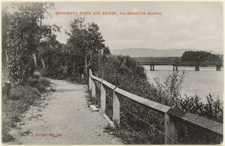 Looking from the river walk in the gardens, to the Fitzherbert Bridge, built 1877, across the Manawatu River. The original donated card was sent to Miss Newman, Cameron Road, Napier and is postmarked 1906.