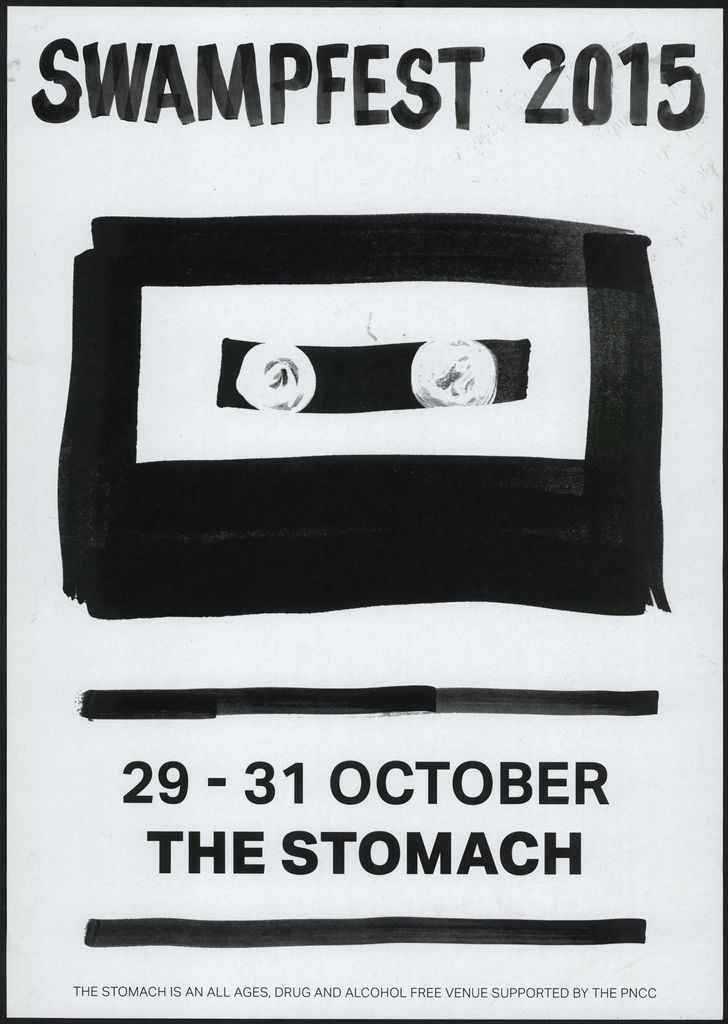Swampfest 2015. 29-31 October. The Stomach. The Stomach is an all ages alcohol/drug/smokefree venue supported by the PNCC. Part of a collection of posters that were displayed at The Stomach, Lombard Street, venue for Creative Sounds Society Incorporated.