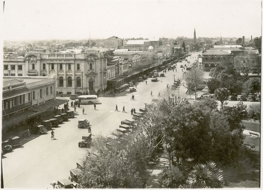 These pages look like are originally from an album. The pages show: Broadway Avenue, Cherry Blossoms in the Esplanade, Grandstand in the Showgrounds after the 1936 gale, "Wrecked Motor Shed" after the 1936 gale, The Square and The Lakelet.