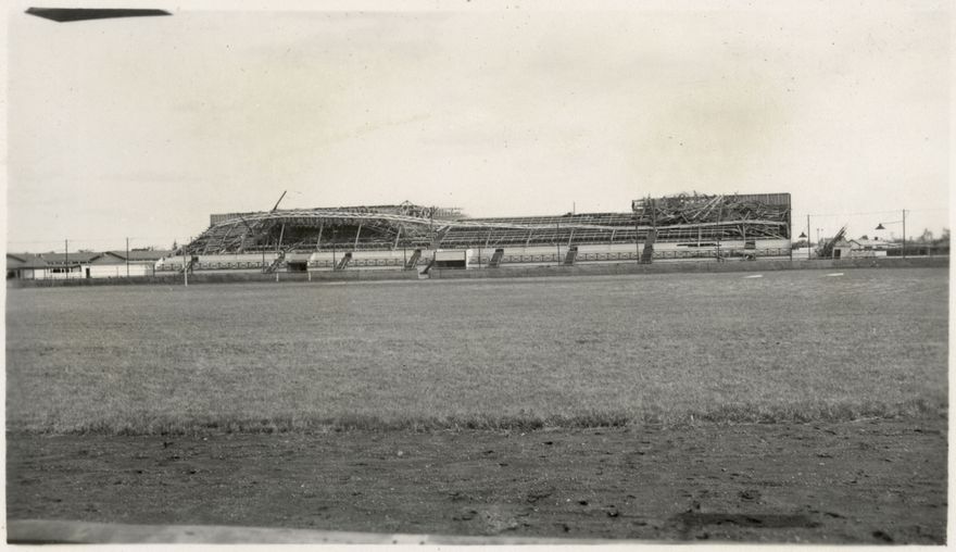 These pages look like are originally from an album. The pages show: Broadway Avenue, Cherry Blossoms in the Esplanade, Grandstand in the Showgrounds after the 1936 gale, "Wrecked Motor Shed" after the 1936 gale, The Square and The Lakelet.