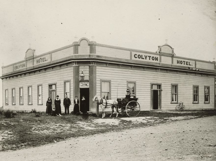 At the time of the photograph the licensee of the Colyton Hotel was James Prosser. The building was burnt down 2 June 1904. It was not rebuilt and the license was transferred to Taihape.