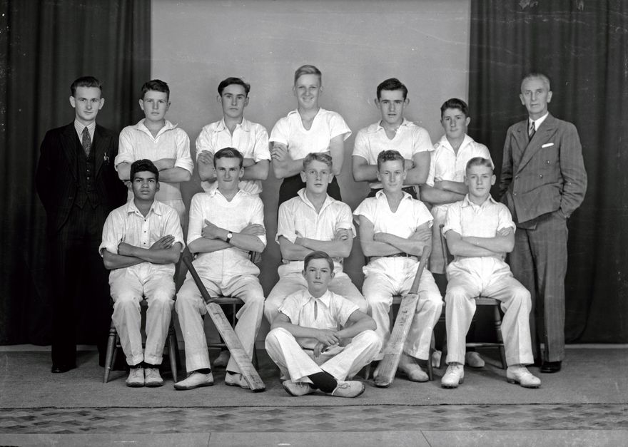 An unknown group of cricket players pose for their official group photograph. They are posed with two cricket bats, one of which is a 'Don Bradman Autograph' Test bat, produced by Sykes and the other is a 'Hammond Autograph' bat produced by Nicolls.