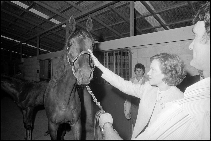 This image was taken by the Evening Standard on the 11th of February 1984 but was not published. It depicts former United States president Jimmy Carter and his wife Rosalynn visiting Highden Park - Herrick and Judy Perry's thoroughbred stud farm at Awahuri.