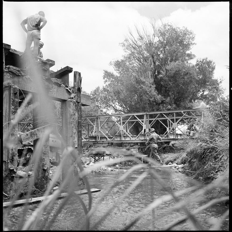This image was taken (but not used) for a story that ran in The Manawatu Evening Standard on 18th January 1966 "Army engineers construct a bailey bridge over the te Awa-o-te Atua stream on the Pohangina East Road -- the scene of a bridge wash out in March 1965. The old wooden bridge in the foreground collapsed and was washed away by flood waters. A temporary, short, bailey bridge spanned the gap, but this was replaced yesterday with a new, but still temporary, bailey bridge."