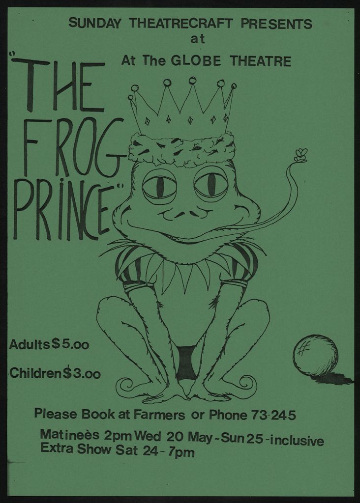 "Sunday Theatrecraft presents at the Globe Theatre. The Frog Prince. Adults $5.00. Children $3.00. Please book at Farmers or Phone 73-245. Matinees 2pm Wed 20 May - Sun 25 - inclusive. Extra show Sat 24 - 7pm." Part of a collection of posters that were displayed in the Public Library in the 1970s - 1980s.
