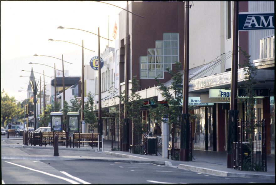 A view of Broadway Avenue, looking in the direction of Princess Street. It includes the Broadway entrance to the Downtown movie theatre. This slide is from a series that was possibly taken for publicity purposes. Based on other images in the set, this image appears to have been taken in the mid-1990s.