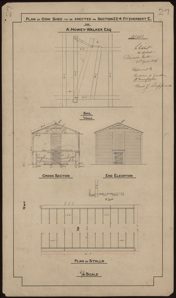 This plan for a Cow Shed was designed by L. G. West for A. Howey-Walker of Fitzherbert East. The shed features stalls for twenty-four cows. The Danish-born architect Ludolph Georg West (1846-1919) established an architectural practice in Palmerston North in about 1880. In 1912 he formed a partnership with is son, Ernest Vilhem West, who continued the business after his father's death.