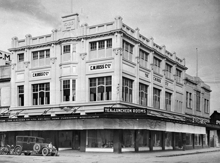 C M Ross Co. Ltd was one of the leading department stores in Palmerston North, with its main entrance on The Square. This three storey building was built in 1915, to add to the number of buildings that comprised the store. The two storey building to the right was also built by C M Ross c 1920, replacing a single storey building.