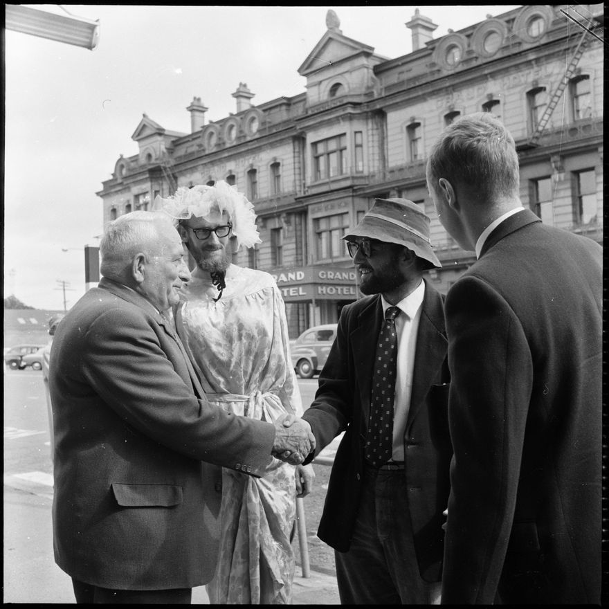 This image was not published in The Manawatu Evening Standard, taken on 6th March, 1963. [Four men, two shaking hands and one dressed as a woman, standing opposite the Grand Hotel.]