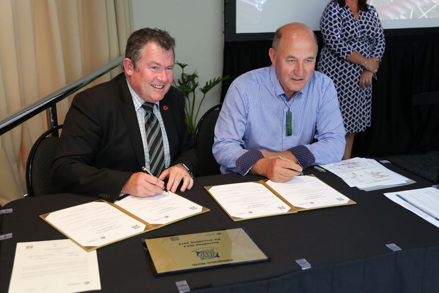 Palmerston North City Mayor Grant Smith and Rangitāne o Manawatū leader Wiremu Te Awe Awe at the Safe Community re-accreditation.