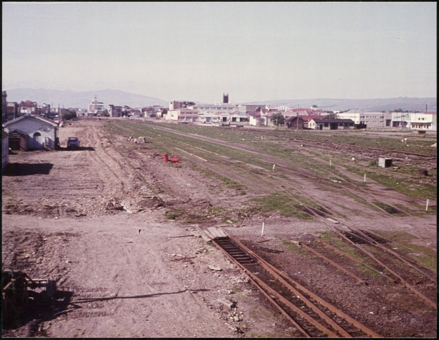 Taken from the Cook Street overbridge looking towards The Square, this image shows the site of the former railway station and yards in Palmerston North, on Main Street. The railway was moved to the outskirts of the city in the 1960s.