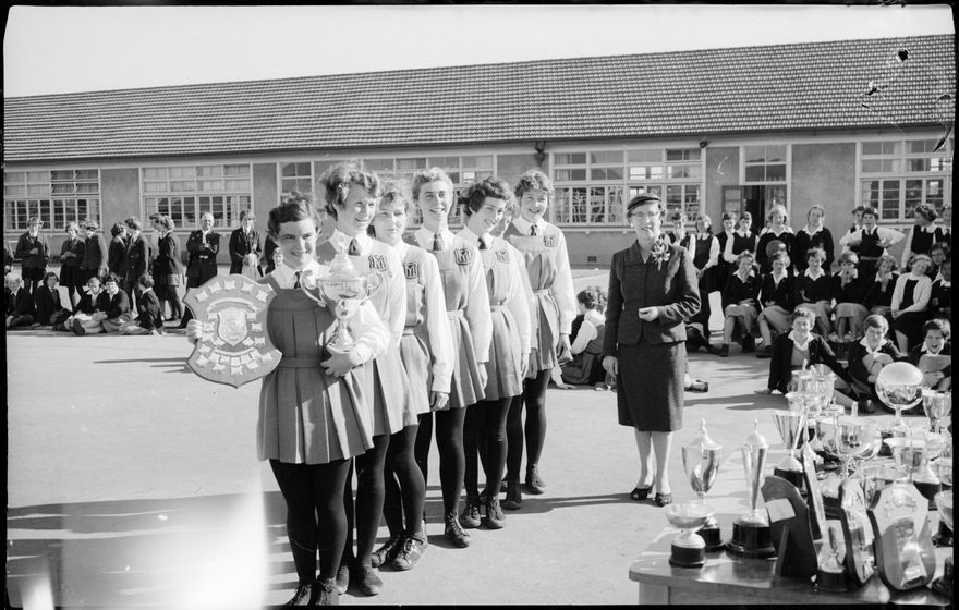 This image was taken for a story that ran in The Manawatu Evening Standard on 28 September, 1959. "The winners of the President's Shield and the Craig Cup are the Manawatu senior A basketball team pictured after the presentation of trophies by Mrs H. H. Craig following the knock-out tournament held at the Intermediate School courts on Saturday. The team is (from left): B. Steffensen (captain), M. Austin, B. Pyne, J. Bailey, S. Gunn, D. Brown and S. Munro. Absent from the photograph are M. Hurley, M. Dowling and J. Crozier. Mrs H. H. Craig is on the extreme right."