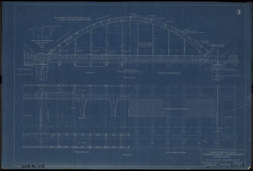 - These four blueprints depict elements of the second Fitzherbert Bridge, which was constructed between 1933 and 1935. During the 1920s the deterioration of the first timber structure and an increase in motor traffic led to calls for a new bridge. In 1929 the Government Main Highways Board offered to pay two thirds of the cost, with the Palmerston North Borough Council and the Kairanga County Council jointly funding the remaining third. Plans and specifications were prepared by the Municipalities Engineering staff under the supervision of John R. Hughes, the City Engineer and the contract was awarded to Fletcher Construction Company Ltd. The new concrete bridge was 256 meters in length with a 6.7 meters wide carriageway and 1.5 meters wide footpath. The structure’s most distinctive feature were the four pairs of bowstring arches, each 34.1 meters wide and 9.2 meters high. The total cost of construction was £34,074. It was demolished in 1987, following the construction of the current Fitzherbert Bridge.