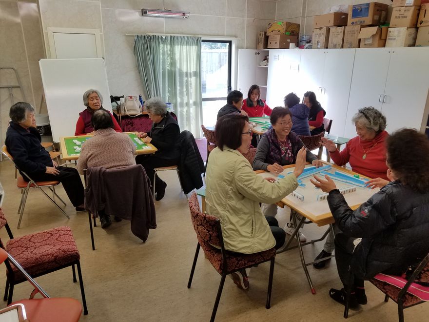 The women in the photo are Chinese New Zealanders from China, Hong Kong, Taiwan and Malaysia who play Mahjong for three to five hours each Monday in the kitchen of the Manawatu Chinese Association Hall at 98 Napier Road, Palmerston North. Some are new learners joining for the fun and health benefits of the game. Once denounced because of its association with gambling, Mahjong is now promoted among elderly people in many countries as a game that encourages mental agility in a social setting.