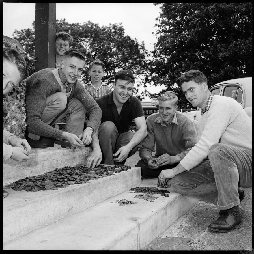 This image was taken for a story that ran in The Manawatu Evening Standard on 18 November 1968, "Counting the 2858 good wishes of people who have made their wish in the Jaycee wishing well in the Square. £20 8s was received at the second cleaning out. Members of the Jaycees counting the large pile of coins are (from the left): Messrs G. Hudson (convener), G. Stephenson, J. Hudson and J. Sutton - Manawatu Standard" photograph."