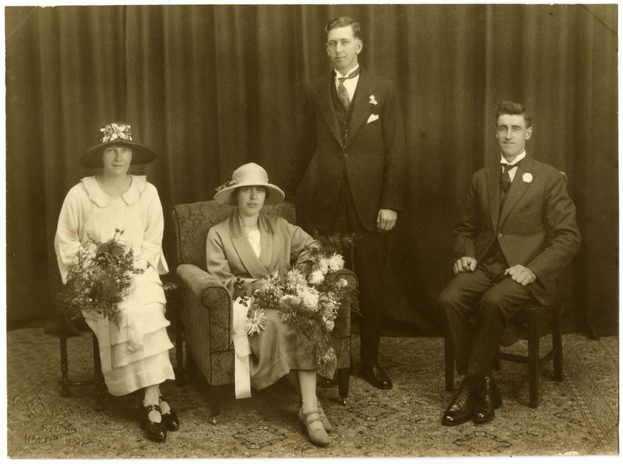 Members of Cameron and Anderson wedding party. L-R: Miss Elsie Collis (cousin of the bride), Ethel Anderson, Kenneth Cameron, Mr. W. Mills (best man). The couple married at St. Andrew's Church in Hastings.
