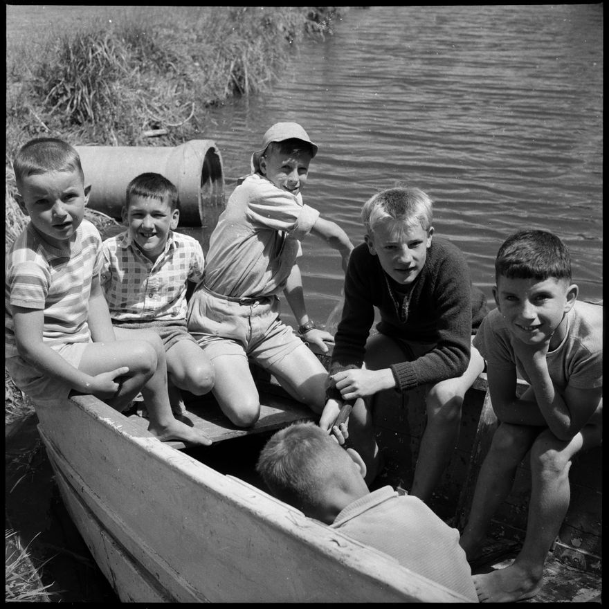 This image was taken for a story that ran in The Manawatu Evening Standard on 5th January, 1963. "There were certainly six boys in the boat, but one was so shy, despite the pleas of his friends, that he would not face the camera. The boys were busy patching a small hole in their boat at the lagoon yesterday and were hoping to catch some eels."