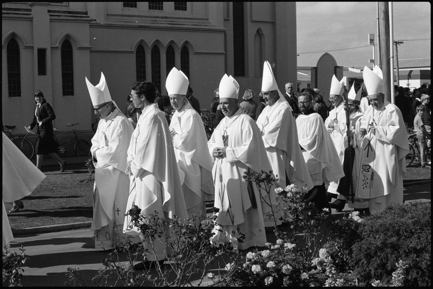 This image was taken by the Evening Standard on the 23rd of April 1980 but was not published. It depicts the consecrating prelates and other clergy leaving St Peter's Catholic Church in Palmerston North after the ordination of Father Peter Cullinane as a Bishop.
