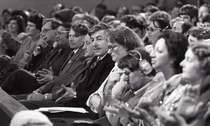 This image was taken (but not used) for a story that ran in The Manawatu Evening Standard on 1 November 1978 “Labour promise to get nation working” and “Rowling in top form at opening”. Labour leader Bill Rowling opened his general election campaign at Palmerston North’s Opera House with a rousing speech to over 1000 supporters on Tuesday 31 October. The Standard reported that, like many political events of recent times, the event was almost a pre-sold affair. Party faithful were granted early admission an hour and half before the public, ensuring a ‘full house’ fifteen minutes after general admittance was granted. When the odd heckler was heard during the event, their voices were quickly put down by other audience members. Spotted in the crowd are Labour spokesperson on social welfare and family affairs Whetu Tirikatene-Smith, former MP for Palmerston North Joe Walding, candidate for Rangitikei Max Hodgson, and Labour candidate for Manawatu Trevor de Cleene.