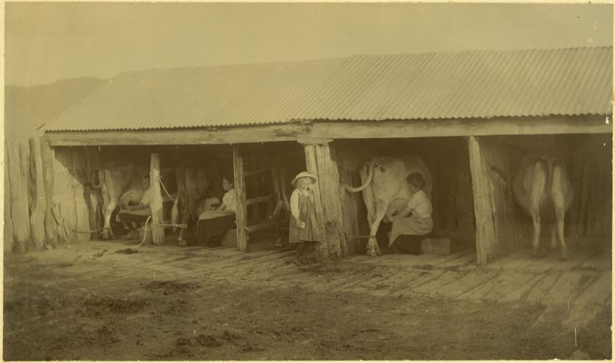 Information on the back of the photograph reads, "Cowshed on W.J. Crowther's farm, Kingston Road, Shannon, about 1908. Female left of small girl, Em? Female right of small girl, Mary? Donation information provides that the small girl, Doris, was born 1902. See "From Bush and Swamp: The Centenary of Shannon, 1887-1987." This picture appears on page 63. See also Pi 602, 633, 635, 638 and 639.