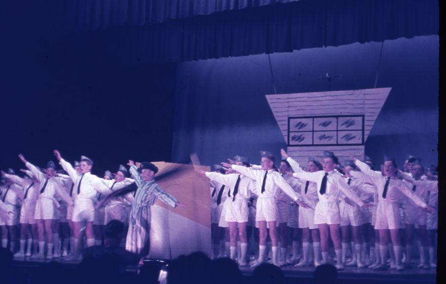 This image depicts the 110 performers and leaders sing for the audience at the Manawatu Scout Gang Show, 1963.