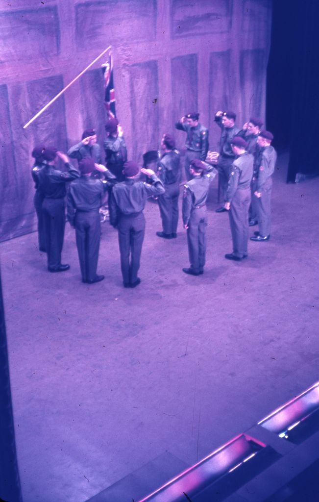 This image depicts the 110 performers and leaders sing for the audience at the Manawatu Scout Gang Show, 1963.