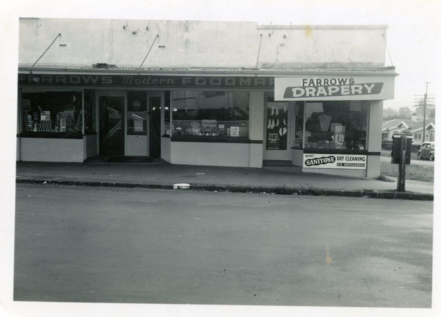 Farrows Four Square Foodmarket and Farrows Drapery. Note on the reverse reads: “not sure if this is P.N” [Palmerston North]