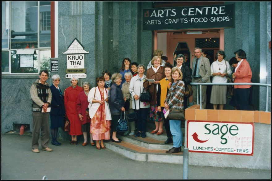 These photographs were taken at the launch of the "Women's Place" pamphlet and exhibition in 1993. Photo 1: Group outside Square Edge. John Thornley (far left), Pamela Benson (12th from left, brown jacket/fair hair), Roni Fitzmaurice (15th from left, grey hair/glasses), Sue Hall (?, 3rd from right). Photo 2: Gaynor Whyte (cutting ribbon) Margaret Weir (at right behind Gaynor Whyte), Noeline Penny (at left behind Gaynor Whyte). Photo 3: Margaret Tate. Photo 4: Margaret Tennant. Photo 5: One scene from the exhibition.