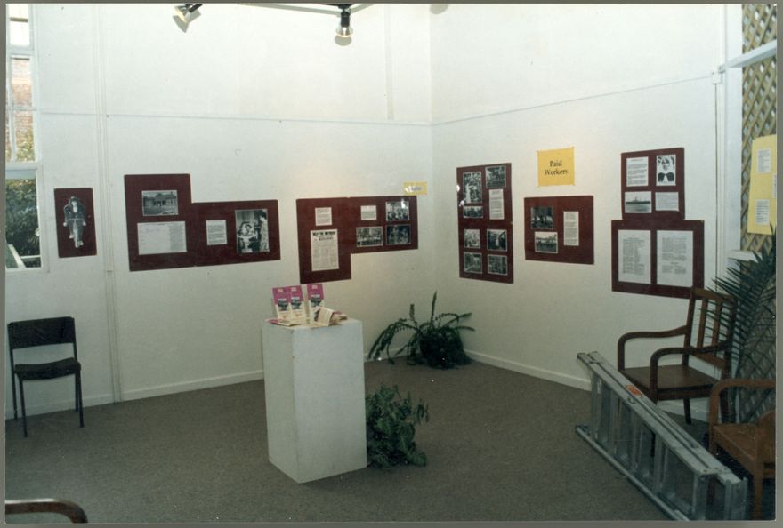 These photographs were taken at the launch of the "Women's Place" pamphlet and exhibition in 1993. Photo 1: Group outside Square Edge. John Thornley (far left), Pamela Benson (12th from left, brown jacket/fair hair), Roni Fitzmaurice (15th from left, grey hair/glasses), Sue Hall (?, 3rd from right). Photo 2: Gaynor Whyte (cutting ribbon) Margaret Weir (at right behind Gaynor Whyte), Noeline Penny (at left behind Gaynor Whyte). Photo 3: Margaret Tate. Photo 4: Margaret Tennant. Photo 5: One scene from the exhibition.