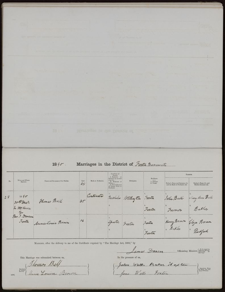 This marriage register was for the Foxton Presbyterian Church from December 1880 to June 1894. The reverend was Reverend James Duncan. It includes registry of marriages outside Foxton and Certificates of Dissolution of Marriages where applicable.