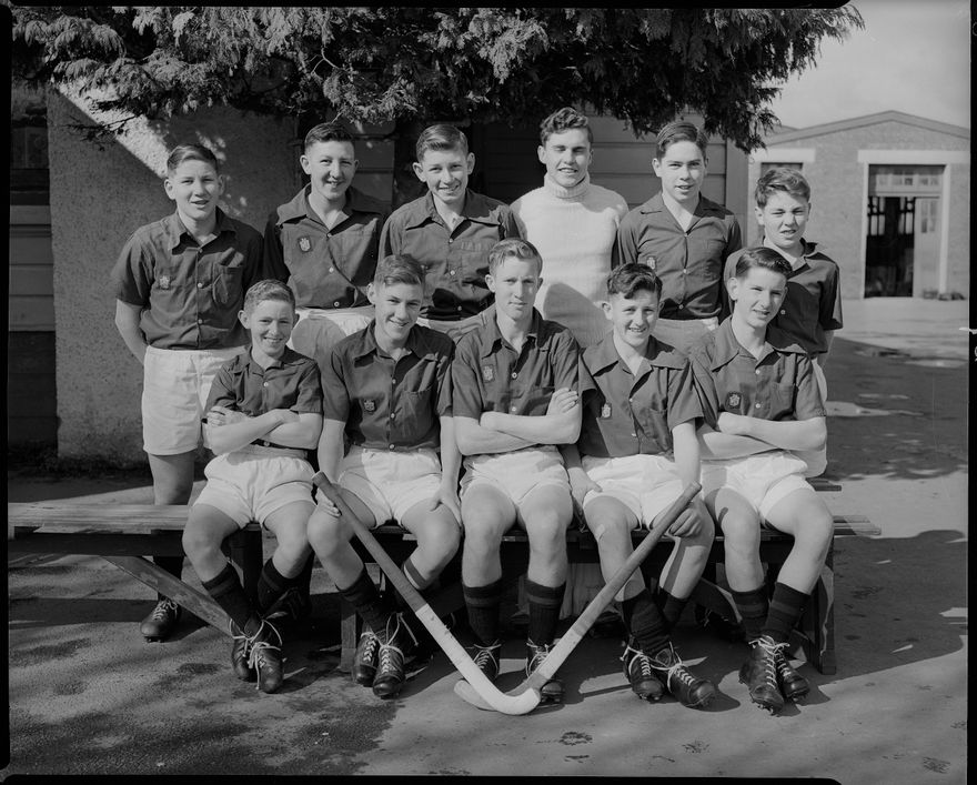 A group of eleven male students pose with hockey sticks. The Palmerston North Technical High School was opened in September 1909 on what is now Princess Street, Palmerston North. In 1956 the school moved to the Rangitikei Street site and became known as Queen Elizabeth Technical College. The original building and site is now used by the Universal College of Learning [UCOL]. This negative comes from the Elmar Collection - a large series of semi-identified and unidentified images from the 1930s-1970s.