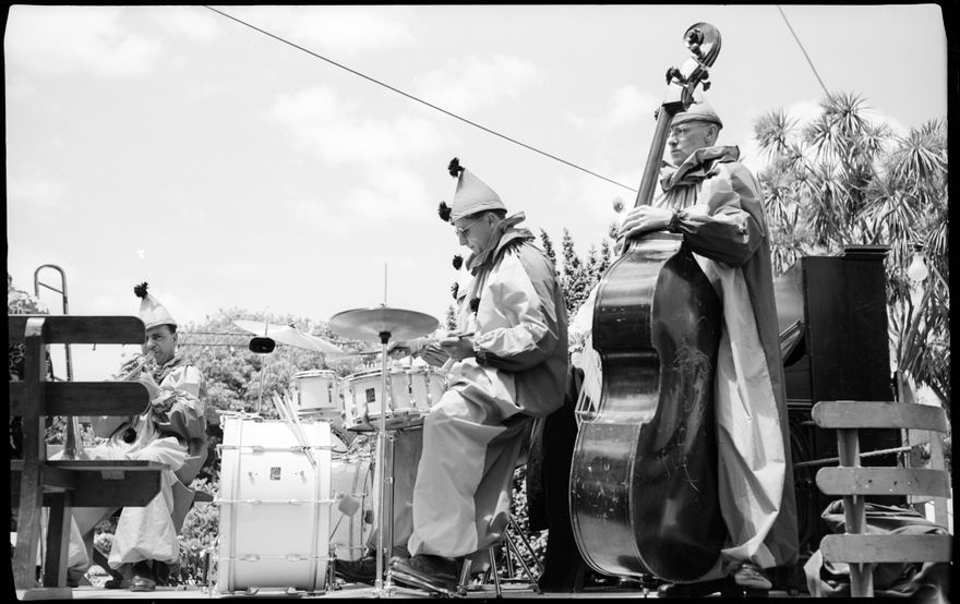 This image was taken for a story that ran in The Manawatu Evening Standard on 29 November 1958: "These four members of the Commercial Travellers' Association entertained a large crowd in the Square yesterday while fellow members raised money for the Community Chest by selling raffle tickets and taking collections."