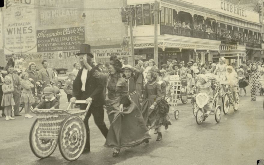 People dressed in period costume parading down Church Street by the Club Hotel. The 75th Jubilee celebrations were an eight day long series of events. On the afternoon of Wednesday, 19 March 1952, a parade around the square entitled ‘Cavalcade of transport through the ages’ was conducted.