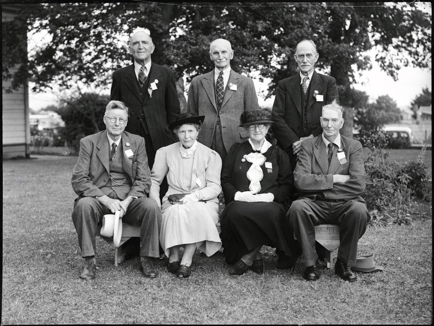 This group of people have gathered for the Woodville school reunion, thought to have taken place on 1949. Woodville School was established in 1878. One of its classrooms is the oldest building still currently in use in New Zealand. At one stage Woodville School catered for children high school aged children before they were bused to Tararua College in 1960.