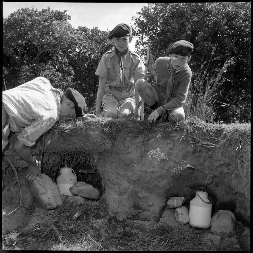 This image was not published in The Manawatu Evening Standard, taken on 25 January, 1964. [Scouts put food into an earth fridge to keep it cool.] See also: 2017N_2017-20_018365, 2017N_2017-20_018371, 2017N_2017-20_018373, 2017N_2017-20_018366, 2017N_2017-20_018368, 2017N_2017-20_018369, 2017N_2017-20_018370, 2017N_2017-20_018372, 2017N_2017-20_018374, 2017N_2017-20_018376
