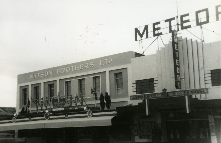 Watson Brothers Ltd and the Meteor Cinema decorated for Queen Elizabeth II visit to Palmerston North.