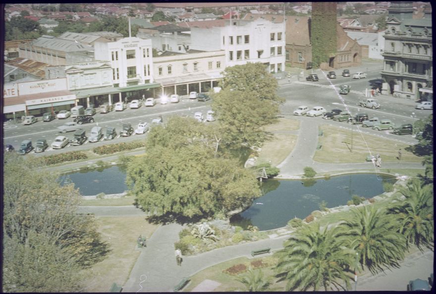 This image is from a series taken around 1957 that shows a view of The Square from the top of the Hopwood Clock Tower. This one shows the corner of Church Street West and The Square, including the Lakelet.