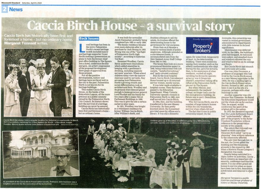 Local historians weekly "Back Issues" article in the Manawatū Standard. History of Caccia Birch House since about 1895. Margaret Tennant writes that despite falling into disrepair at times, it is one of the few grand old homes in Palmerston North to survive when many others have been lost.