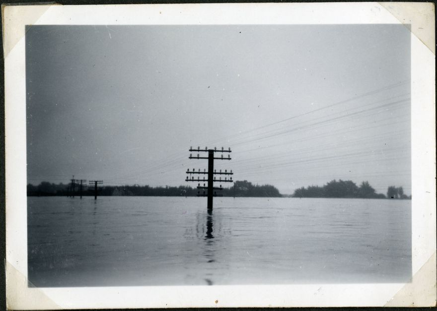 The 1953 flood in Rangiotu was one of the worst in history, in the area. As seen, the floodwaters have almost reached the wires of the power lines.