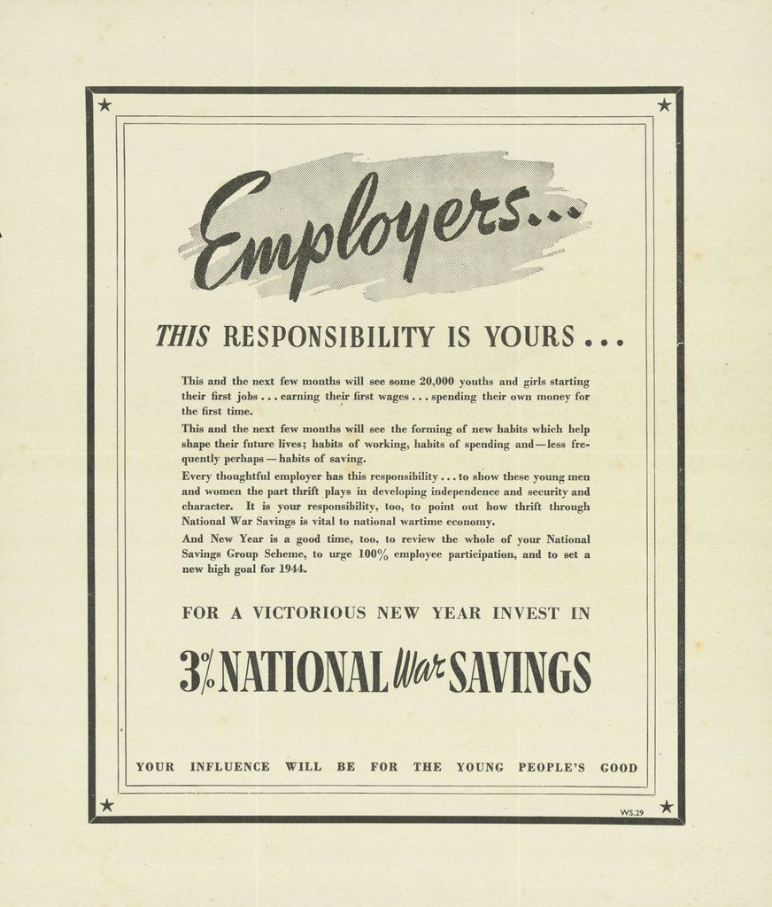 A notice to employers, about encouraging employees to invest in National War Savings during World War Two. From the archive of 'C E Warburton'.