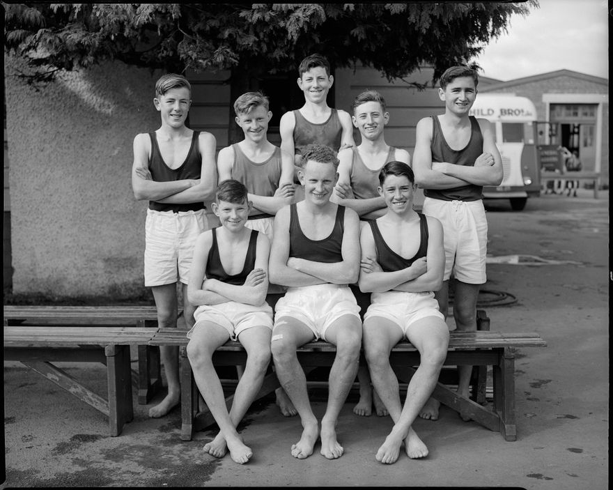 A group of eight male students pose in their athletics uniforms. The Palmerston North Technical High School was opened in September 1909 on what is now Princess Street, Palmerston North. In 1956 the school moved to the Rangitikei Street site and became known as Queen Elizabeth Technical College. The original building and site is now used by the Universal College of Learning [UCOL]. This negative comes from the Elmar Collection - a large series of semi-identified and unidentified images from the 1930s-1970s.