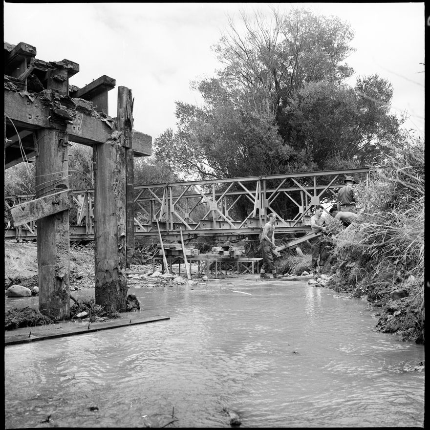 This image was taken (but not used) for a story that ran in The Manawatu Evening Standard on 18th January 1966 "Army engineers construct a bailey bridge over the te Awa-o-te Atua stream on the Pohangina East Road -- the scene of a bridge wash out in March 1965. The old wooden bridge in the foreground collapsed and was washed away by flood waters. A temporary, short, bailey bridge spanned the gap, but this was replaced yesterday with a new, but still temporary, bailey bridge."